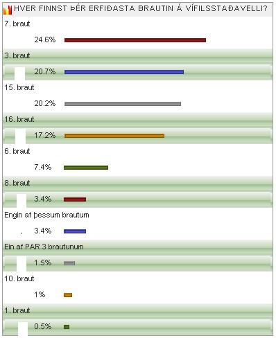 Í öðru sæti varð 3. brautin með 20,7% atkvæða þá 15. brautin sem nú hefur reyndar verið breytt með 20,2%, 16. braut 17,2% og 6. braut með 7,4%. Aðrar brautir fengu minna. Að neðan má sjá hvernig kylfingar röðuðu brautunum.