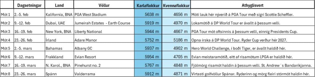 Alls verða 8 mót og gilda 4 bestu mótin í heildarkeppninni.