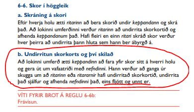 Almennar golfreglur gilda hvað þetta varðar (sjá mynd) og því bendum við vinsamlegast á að ganga frá kortum og skila þeim undirrituðum sem fyrst að leik loknum. Skila má skorkortum með þeim hætti að taka mynd af þeim, eftir að þau hafa verið undirrituð af leikmanni og ritara, og senda til yngvi@gkg.is . Það að skila skorkorti ekki samdægurs getur varðað frávísun úr umferðinni.